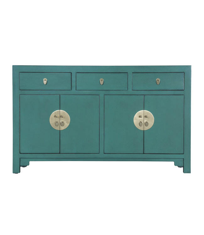 In de Chinese traditie verwijst pine green naar dennenbomen, die levensduur en kracht symboliseren, en staat het voor harmonie, rust en natuur. Het is verbonden met balans en groei, waardoor het ook een symbool van welvaart en vernieuwing is. Deze Oosterse opbergkast heeft drie lades en een opbergruimte met vier deuren. De ronde handvatten zijn een symbool voor volledigheid en rijkdom. De ronde bronzen achtergrond op de deur in combinatie met de vierkante vorm vertegenwoordigt het traditionele Chinese filosofische concept van Tian Yuan Di Fang (orbiculaire lucht en rechthoekige aarde).