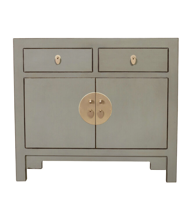 Olijf grijs symboliseert natuur en rust en vertegenwoordigt een gevoel van elegantie en harmonie. Deze Oosterse opbergkast heeft twee lades en een opbergruimte met twee deuren. De ronde handvaten zijn een symbool voor volledigheid en rijkdom. De ronde bronzen achtergrond op de deur in combinatie met de vierkante vorm vertegenwoordigt het traditionele Chinese filosofische concept van Tian Yuan Di Fang (orbiculaire lucht en rechthoekige aarde).