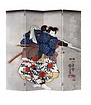 Praktisch canvas kamerscherm 4 panelen geprint met een afbeelding van witte Japanse samurai. Het dubbelzijdig kamerscherm is multi-functioneel en kan bijvoorbeeld ruimtes in een kamer afscheiden, een raam bedekken of als decoratief element dienen.